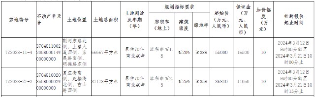 2023年12月26日,經滕州市人民政府批準,滕州市自然資源局決定在棗莊市公共資源交易網以網上掛牌的方式公開出讓2宗國有建設用地使用權,起拍總價91810萬元,出讓面積103840平方米,具體情況如下: