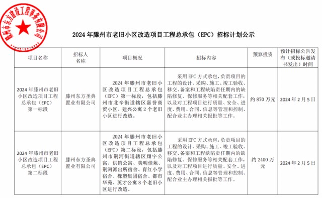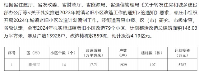 1月5日,2024年滕州市老舊小區改造項目工程總承包(EPC)招標計劃公示,招標計劃顯示共有14個小區列入改造名單,共預算投資4900萬元。