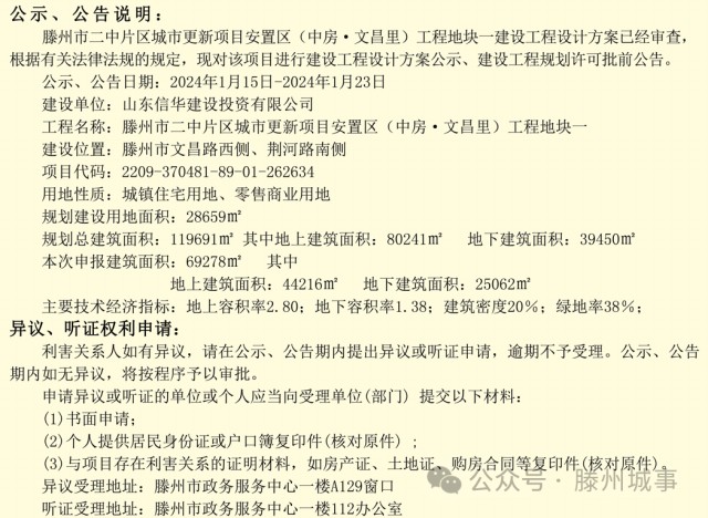 滕州市二中片區城市更新項目安置區工程地塊一建設工程設計方案公示、建設工程規劃許可批前公告