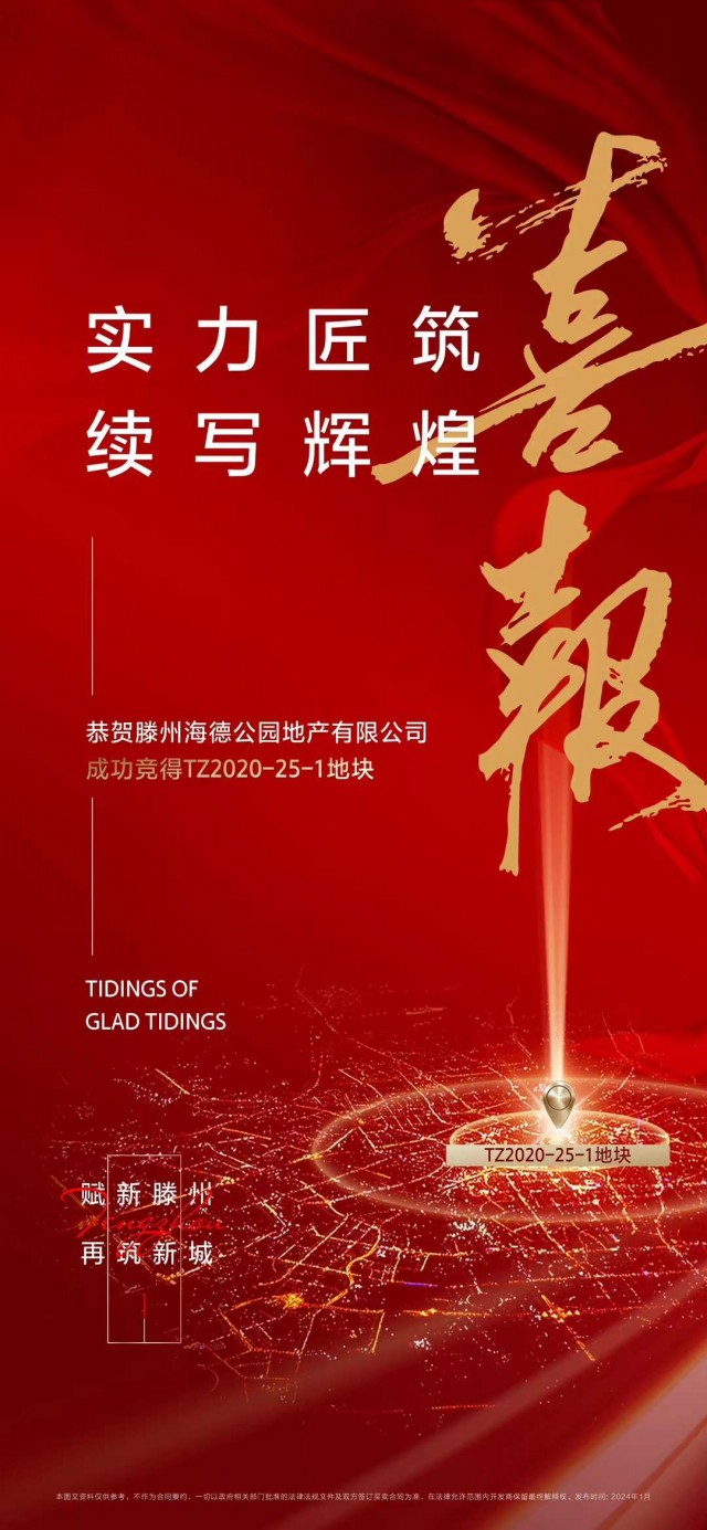 2024年1月18日,滕州成功掛牌出讓一宗居住用地。滕州海德公園地產有限公司以35640萬元的價格拿下TZ2020-25-1號宗地,成交樓面價約6251元/㎡。