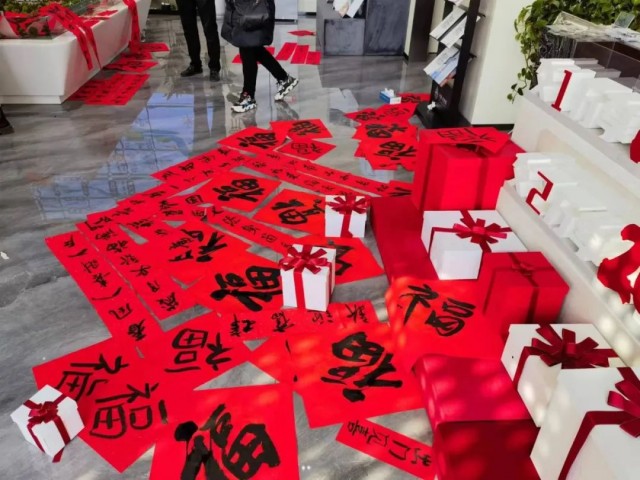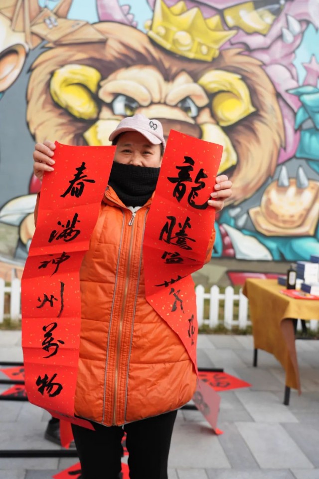 活動現場書法老師們將真誠的祝福付諸筆端,他們紅幅鋪展、飽蘸濃墨,奮筆疾書、筆鋒婉轉、濃墨飄香,春聯與“?!弊謿忭嵣鷦印⒃⒁庀矐c吉祥,滿載著對美好祝愿,讓整個現場洋溢著濃濃的年味。