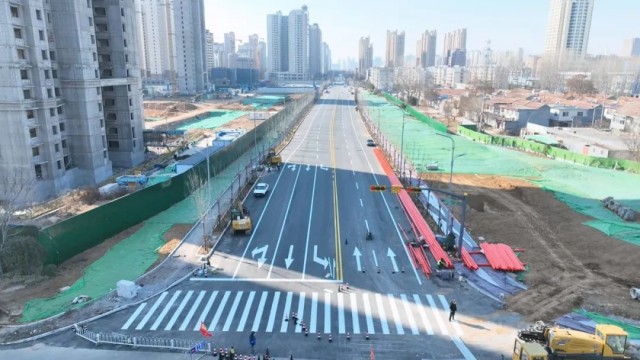 施工現場,雙向四車道的機動車道及非機動動車道瀝青鋪設已經完成,機動車道交通標志線及路燈設施已經安裝到位,目前已基本具備通車條件。