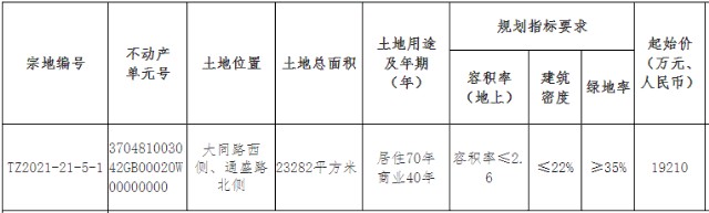 TZ2021-21-5-1宗地:位于大同路西側、通盛路北側,土地面積23282平方米(約為34.92畝);居住70年、商業40年用地;容積率≤2.6;建筑密度≤22%;綠地率≥35%。按照地上容積率2.6計算,折合起拍樓面價約3173元/平方米。