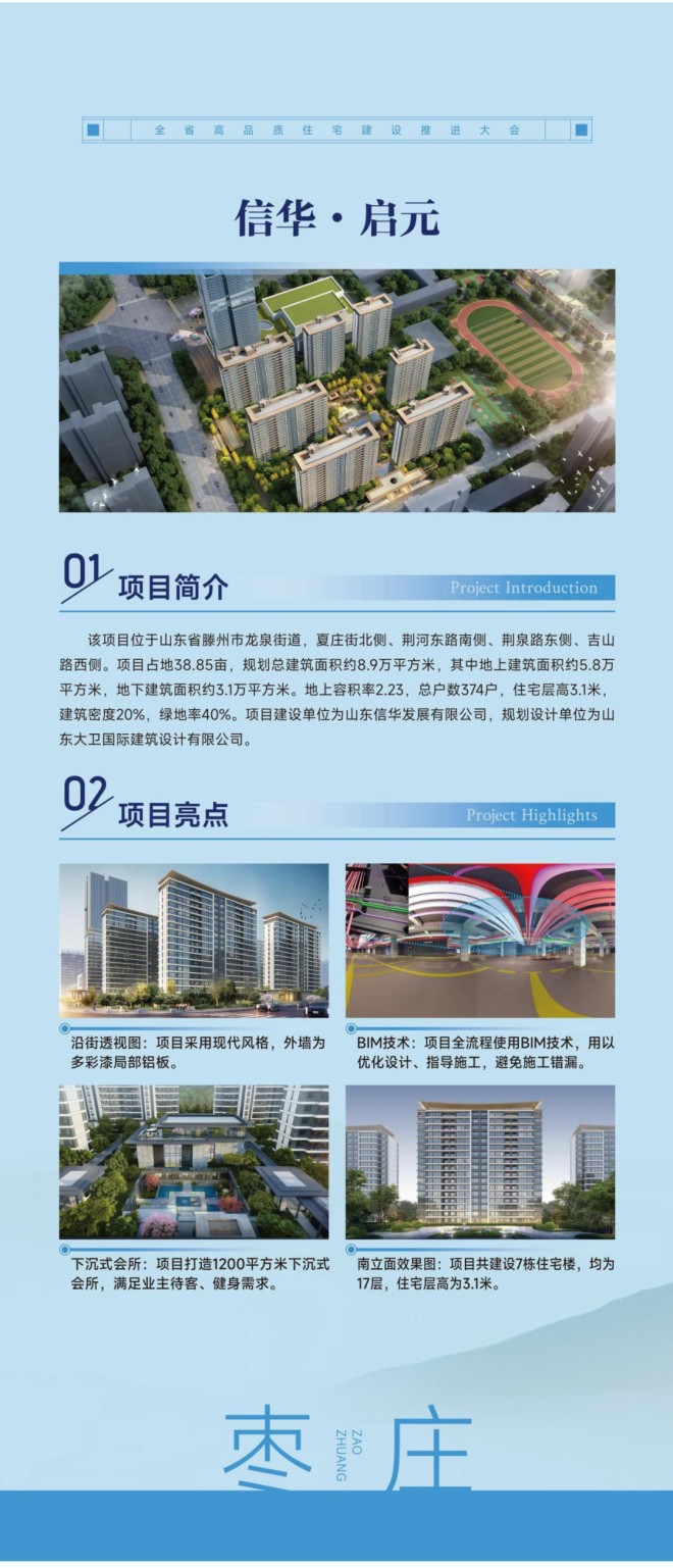 信華·啟元項目位于荊河路南側、夏莊街北側、荊泉路東側、吉山路西側,總規劃建設用地面積4.33萬平方米,劃分為商業區和住宅區(其中,商業區規劃建設用地約1.74萬平方米,住宅區規劃建設用地約2.59萬平方米),總建筑面積15萬平方米,地上容積率2.39,定位為高品質改善型住宅。2024年初,信華·啟元項目榮獲“山東省高品質住宅設計競賽”專項獎三等獎。