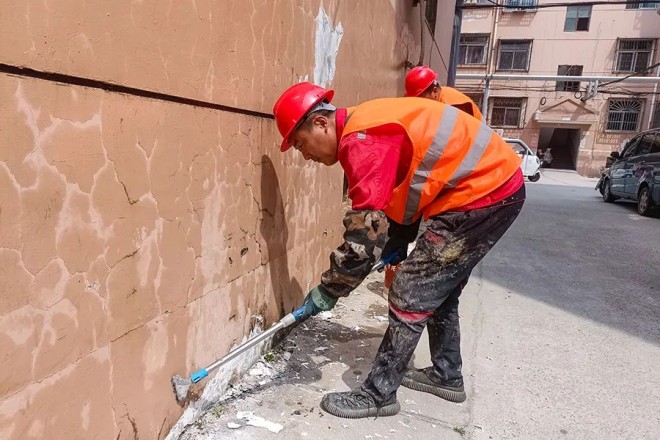 4月22日,走進供銷公寓,看到工人們正在進行外墻基層清理,現場一片忙碌的施工景象。現場施工負責人宋士強經理介紹,本次對該小區改造的主要內容有內外墻粉刷雨污管網分流、綠化和車位增補、屋頂防水、瀝青路面鋪設等。