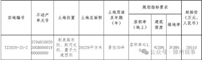 TZ2020-25-2地塊位于荊泉路東側、荊河北側、墨子大道西側,土地總面積26229平方米,土地用途及年期為居住70年,容積率(地上)≤1.8,建筑密度≤20%,綠地率≥38%,起始價29510萬元。按照最高地上容積率1.8計算,起拍樓面價約6250元/㎡。