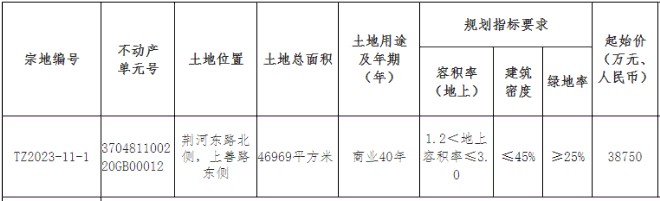 TZ2023-11-1宗地,位于荊河東路北側,上善路東側,土地總面積46969平方米,土地用途、年期為商業40年。