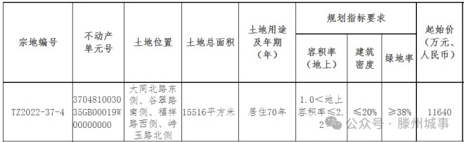TZ2022-37-4號出讓宗地位于大同北路東側、谷翠路南側、福祥路西側、峙玉路北側,出讓土地面積為15516平方米,規劃用途為居住用地,出讓年限70年。
