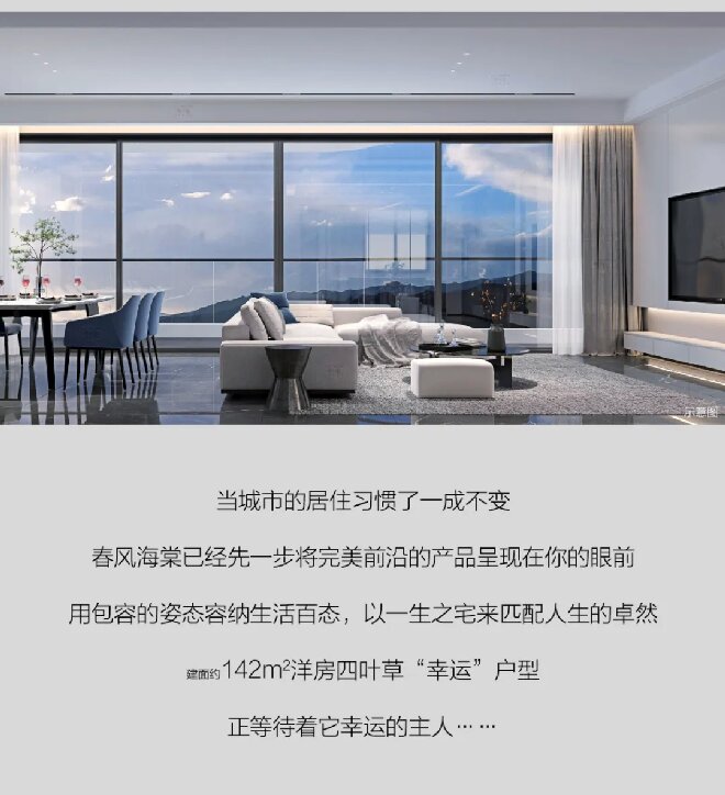 3、本宣傳資料內提到的商品房面積均為建筑面積,特別說明的除外;本宣傳資料所涉及的戶型僅供示意參考,所標尺寸面積、室內裝修設計方案僅供參考,非實際交樓衡量之基準。相同戶型因樓棟、單元或樓層不同,局部結構、面積、尺寸、管線布置等可能存在差異,具體以《商品房買賣合同》為準;