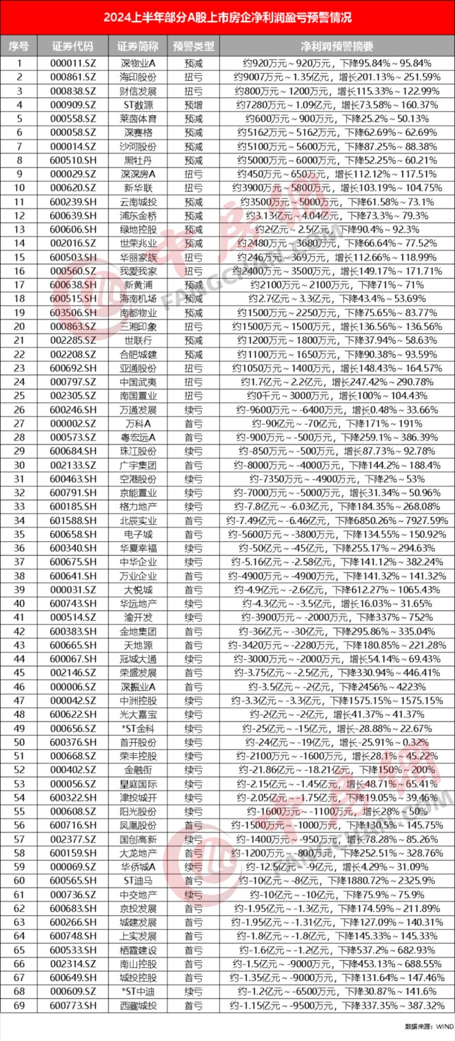附:2024上半年部分A股上市房企凈利潤盈虧預警情況