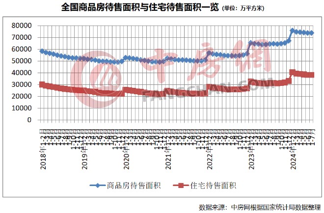 此外,在庫存方面,商品房待售面積在連續4個月下降的態勢下略有回升。截至7月末,商品房待售面積73926萬平方米,同比增長14.5%。其中,住宅待售面積繼續下降,為38238萬平方米,同比增長22.5%。