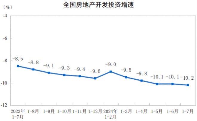 具體來看,在房地產開發投資方面,國家統計局數據顯示,1-7月份全國房地產開發投資60877億元,同比下降10.2%;其中,住宅投資46230億元,下降10.6%。