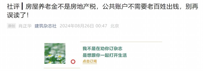 8月26日,住建部唯一直屬期刊出版單位《建筑雜志社》微信公眾號發布社評《房屋養老金不是房地產稅,公共賬戶不需要老百姓出錢,別再誤讀了!》。