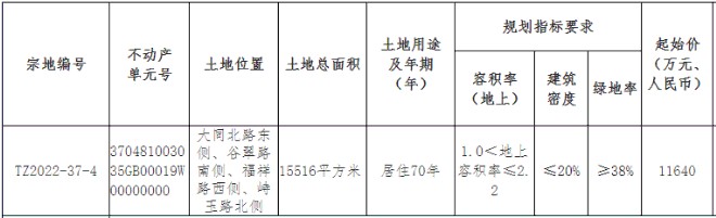 TZ2022-37-4宗地位于大同北路東側、谷翠路南側、福祥路西側、峙玉路北側,土地總面積15516平方米,土地用途為居住70年。規劃指標要求:容積率(地上)1.0<地上容積率≤2.2;建筑密度≤20%;綠地率≥38%。起始價11640萬元。