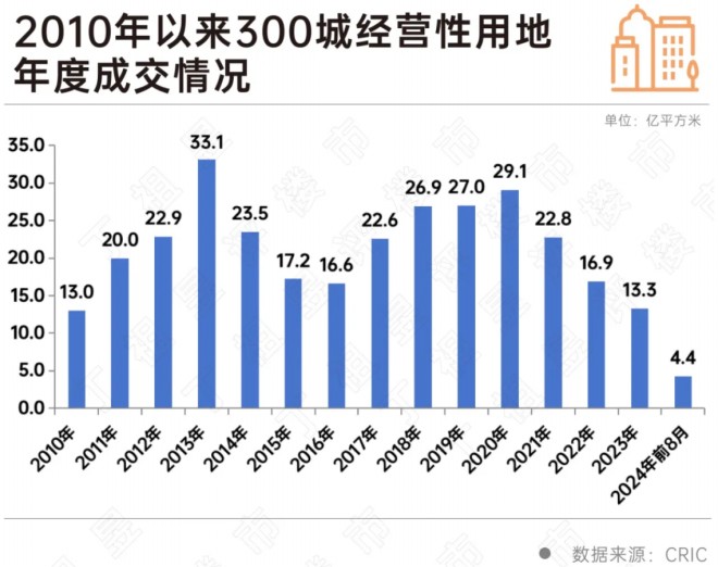 CRIC數據顯示,截止8月27日,全國300城經營性土地成交4795萬平方米,環比上月同期下降6%,同比下降30%。從前8月土地成交規模來看,約4.4億平方米,同比2023年同期下降兩成左右,供地節奏明顯變緩。