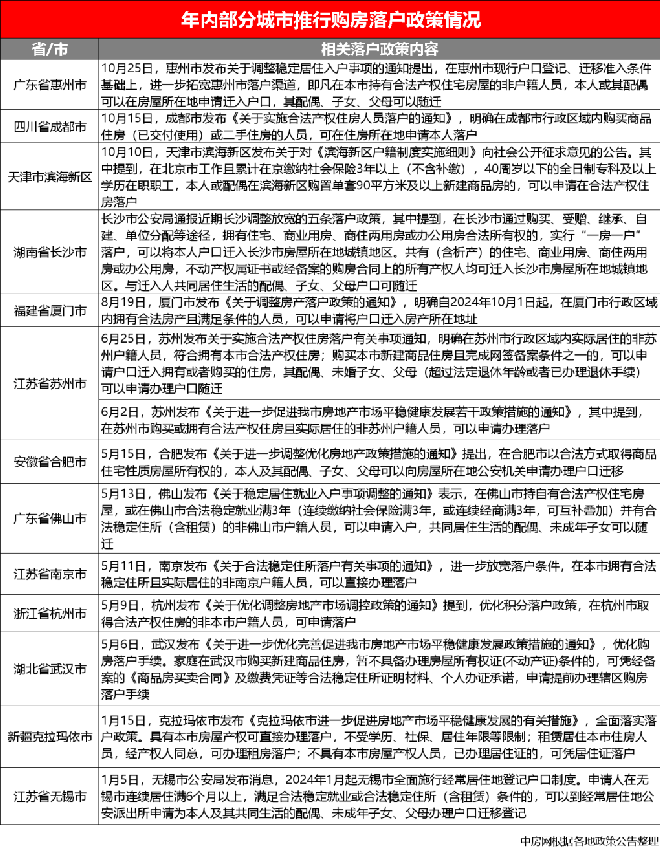 據中房網不完全統計,2024年以來,全國至少有江蘇省蘇州市、南京市、無錫市,廣東省惠州市、佛山市,四川省成都市,福建省廈門市,安徽省合肥市,浙江省杭州市,湖南省長沙市、湖北省武漢市,新疆克拉瑪依市和天津市濱海新區13地出臺了購房即可申請落戶的相關政策。