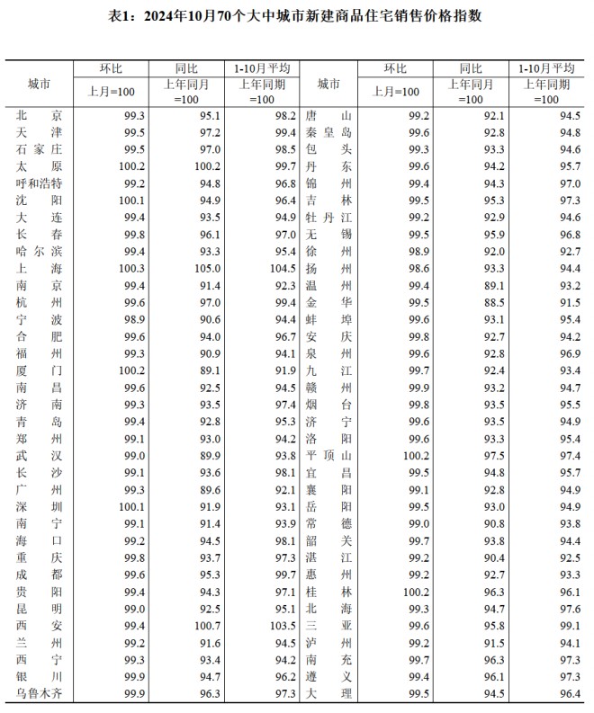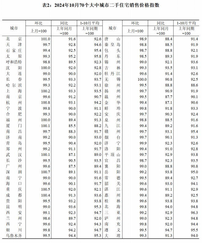 國家統計局發布的《70個大中城市商品住宅銷售價格變動情況》顯示,2024年10月份70個大中城市中新建商品住宅和二手住宅銷售價格環比上漲城市分別有7個和8個,比上月分別增加4個和8個;同比上漲城市分別有3個和0個,比上月分別增加1個和持平。