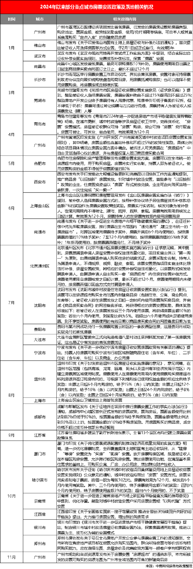 今年以來,在消化存量房的行業大背景下,落地房票安置政策的城市數量明顯增加。據相關統計,2024年以來,已有超50地推出房票安置政策,并配套了一些優惠措施來鼓勵該種安置方式。