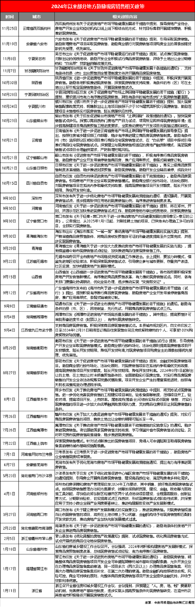 11月份,安徽六安市、云南西雙版納州、寧夏吳忠市、四川甘孜州等地陸續出臺鼓勵現房銷售的相關政策。據中房網不完全統計,2024年以來,全國至少已有浙江、河南、陜西、山西、云南和青海等6個省,深圳、鄭州、無錫、蕪湖、銀川、煙臺等32個城市發布了推進現房銷售的相關政策或細則。