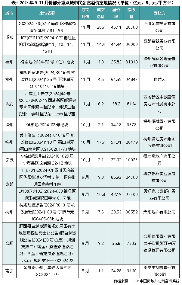 根據CRIC統計,30個重點城市在新政出臺后的(9-11月)土地成交中,民企高溢價拿地(溢價率超過20%)的情況主要發生在成都、杭州等城市。