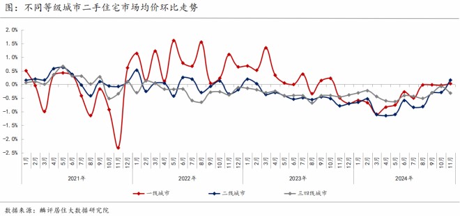 從各線城市表現來看,11月份一二線城市二手房市場均價率先止跌轉漲,三四線仍在下行。