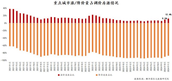 根據麟評居住大數據研究院監測,11月重點14城調價房源中漲價房源占比為12.4%,較上月上升2.9個百分點,同比上升6.6個百分點。重點14城漲價房源占比繼續上升,且達近18個月以來占比新高。