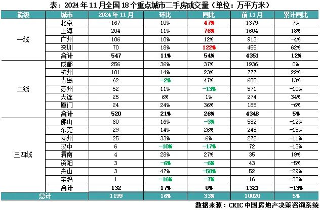 CRIC數據顯示,11月18個重點城市二手房成交面積預計為1199萬平方米,環比增長16%,同比增長33%。從前11月情況看,累計成交面積預計為10020萬平方米,同比增長5%。