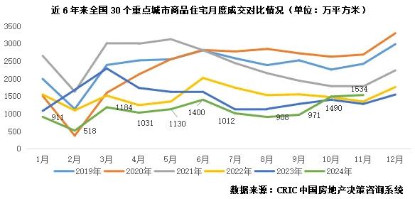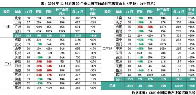 CRIC數據顯示,11月30個重點城市整體成交1534萬平方米,環比微增3%,同比增長20%,與三季度月均值相比增長59%,前11月累計同比降幅收窄至26%。