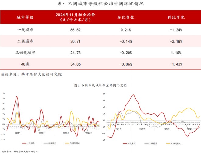 報告顯示,11月一線城市平均租金為85.52元/平方米/月,環比上漲0.21%,同比下跌1.24%;二線城市平均租金為30.71元/平方米/月,環比下跌0.14%,同比下跌2.18%;三四線城市平均租金為24.78元/平方米/月,環比下跌0.2%,同比上漲1.15%。