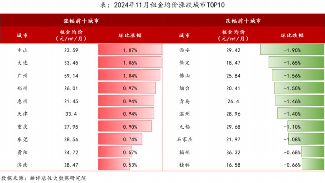 隨著居民收入預期下行,租房的消費降級。保障性租賃住房加速入市,租金缺乏上漲動力等原因,11月租金環比上漲城市個數減少。