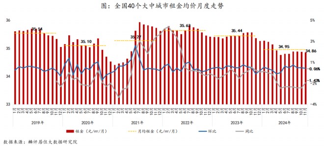 麟評居住大數據研究院近日發布的報告顯示,2024年11月份全國40個大中城市租金掛牌均價為34.86元/平方米/月,環比下跌0.06%,同比下跌1.43%。前11月全國大中城市平均租金為34.95元/平方米/月,較去年月均租金下降1.38%。