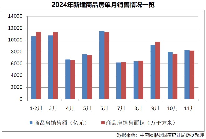 從單月情況看,新建商品房銷售面積和銷售額都實現了正增長。根據中房網測算,11月份新建商品房銷售面積為8188萬平方米,環比上漲7.09%,同比上漲3.25%;新建商品房銷售額為8270億元,環比上漲3.7%,同比上漲1.39%。