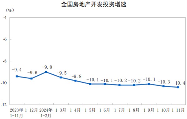 具體來看,房地產開發投資方面,該指標連續7個月保持在兩位數跌幅水平。國家統計局數據顯示,1-11月份全國房地產開發投資93634億元,同比下降10.4%;其中,住宅投資71190億元,下降10.5%。