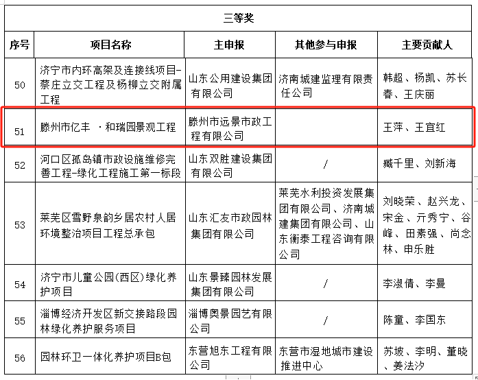 近日,山東省園林綠化行業協會、山東省建設建材工會組織開展的2024年度“園林優質工程”優秀成果競賽活動評選結果揭曉,由遠景公司承建的億豐·和瑞園景觀工程,榮獲山東省園林綠化行業2024年度“園林優質工程”三等獎。這是繼2023年后遠景公司再次榮獲該獎項。
