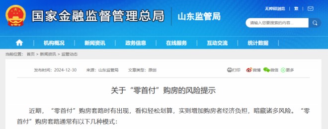 近日,國家金融監督管理總局山東監管局網站發布風險提示,公布“零首付”購房套路的幾種模式。近期,“零首付”購房套路時有出現,看似輕松劃算,實則增加購房者經濟負擔,暗藏諸多風險?!傲闶赘丁辟彿刻茁吠ǔS幸韵聨追N模式: