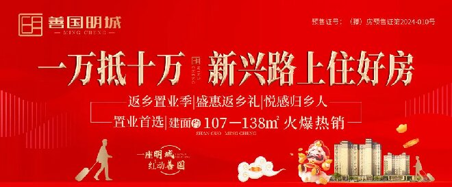 返鄉置業給夢想一個安放心靈的地方,給家人兌現一個更好的未來,善國明城新年煥新家,返鄉置業專享鉅惠一萬抵十萬,助力團圓,讓理想實現!