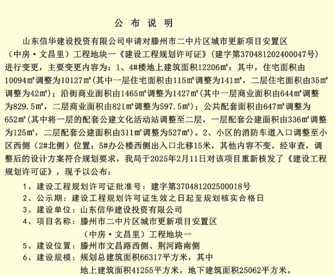 滕州市二中片區城市更新項目安置區工程地塊一建設工程規劃許可變更批后公布