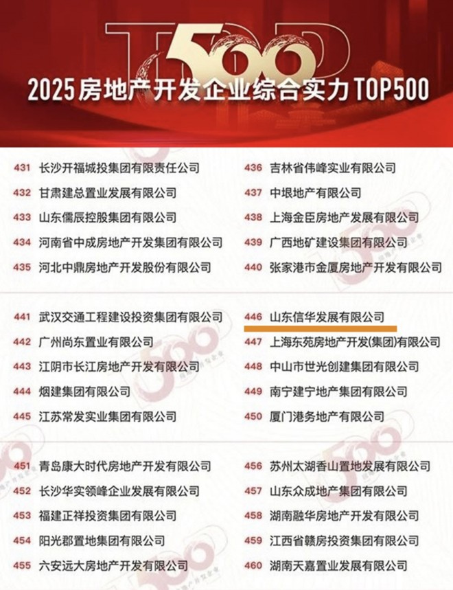 3月19日,備受關注的2025中國房地產TOP500測評成果發布會暨房地產企業發展高峰論壇在北京圓滿舉行。山東信華發展有限公司憑借強勁的綜合實力和品牌影響力,榮膺“2025房地產開發企業綜合實力TOP500”。