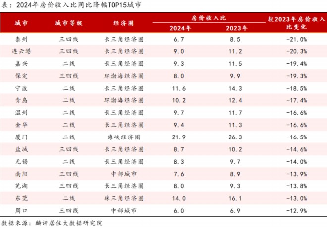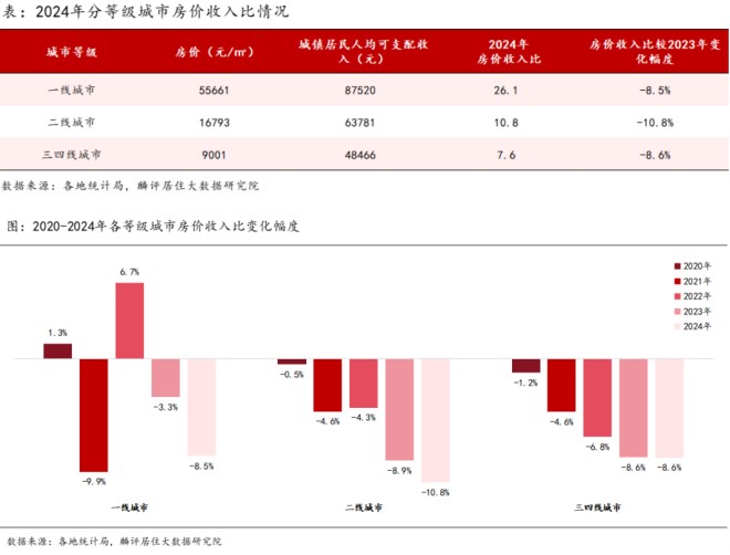 麟評居住大數據研究院發布的報告顯示,其監測100個重點城市2024年房價收入比為10.3,相比2023年降低9.7%,自2020-2024年期間房價收入比呈連年下降態勢。