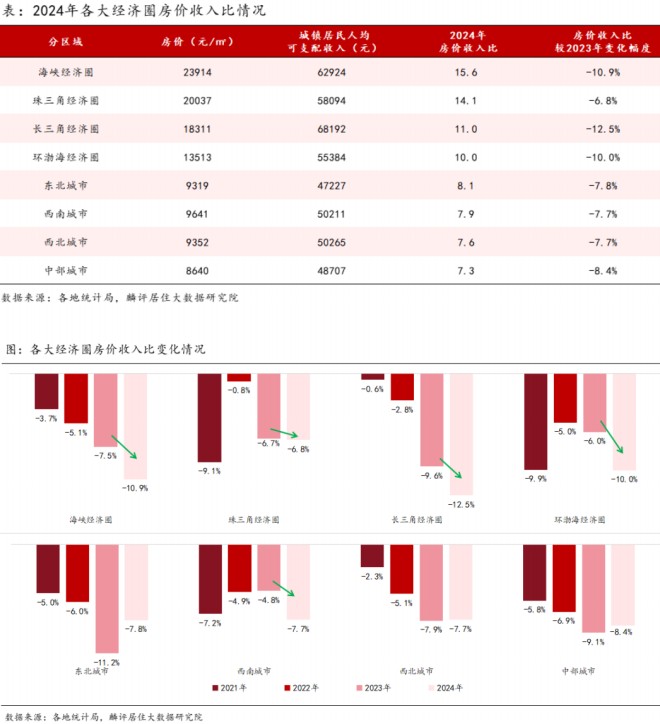從區域表現來看,高房價收入比區域為經濟發展較為活躍的區域,集中了大量高端產業和優質資源。如海峽經濟圈、珠三角和長三角經濟圈位居前三,2024年房價收入比分別為15.6、14.1和11.8。