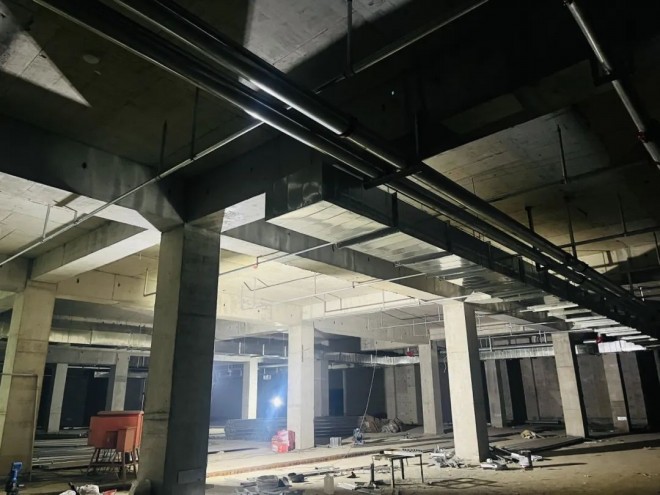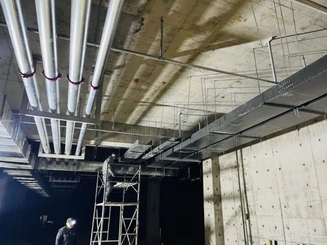 通風系統對于地下車庫而言,猶如人體的呼吸系統,其重要性不言而喻。這些通風管道的材質經過精心挑選,具備良好的通風性能與防火、防潮特性。安裝過程堪稱一場精密的協作,工人們如同技藝嫻熟的工匠,精準地將一節節管道拼接在一起。他們借助專業的吊裝設備,小心翼翼地將管道提升至指定位置,再通過精準測量與反復調試,確保管道的安裝角度和連接緊密程度都符合設計標準。如今,通風管道已完成大半鋪設工作,它們沿著車庫頂部蜿蜒伸展,猶如一條條巨龍盤踞其中,仿佛已經在為未來的通風換氣工作蓄勢待發,為大家在車庫內提供清新、舒適的空氣環境奠定了堅實基礎。