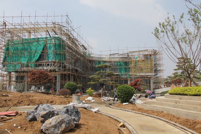 時至暮春,初夏將近。城建集團梁場區域改造項目售樓處工程現場,施工人員斗志昂揚,以只爭朝夕的勁頭投入施工,工程現場一派熱火朝天的繁忙景象。目前,售樓處工程建設已進入內外裝飾與景觀營造并行的關鍵階段。