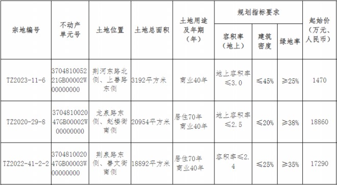 TZ2023-11-6號宗地,位于荊河東路北側、上善路東側,土地總面積3192平方米。土地用途為商業40年。規劃指標要求地上容積率≤3.0,建筑密度≤45%,綠地率≥25%。起始價1470萬元。按照最高容積率計算,折合樓面價約1535.09元/平方米。