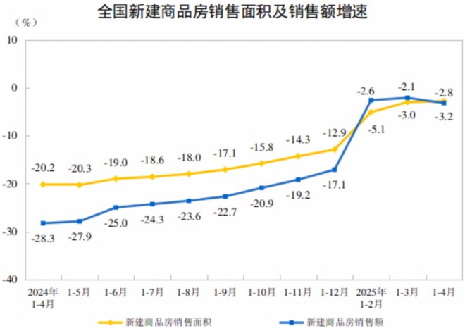 根據國家統計局數據,1-4月份,新建商品房銷售面積28262萬平方米,同比下降2.8%,降幅比1-3月份收窄0.2個百分點;其中住宅銷售面積下降2.1%。新建商品房銷售額27035億元,下降3.2%;其中住宅銷售額下降1.9%。
