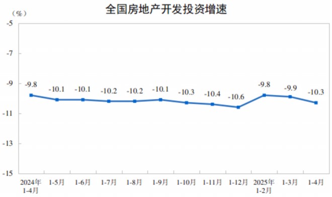 具體來看,房地產開發投資方面,增速略有下滑。數據顯示,1-4月份全國房地產開發投資27730億元,同比下降10.3%;其中,住宅投資21179億元,下降9.6%。