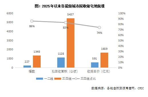 整體來看,本輪收儲宅地主要集中于三四線城市??硕饠祿@示,就已公布土地屬性的地塊清單來看,三四線城市擬收儲面積達5437公頃,占比超過八成;對應金額為1659億元,占比74%。