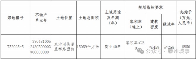 TZ2025-5號宗地位于東沙河街道呈祥路西側,土地總面積15059平方米,土地用途及年期為商業40年,地上容積率≤2.0,建筑密度≤45%,綠地率≥25%,起始價6850萬元。
