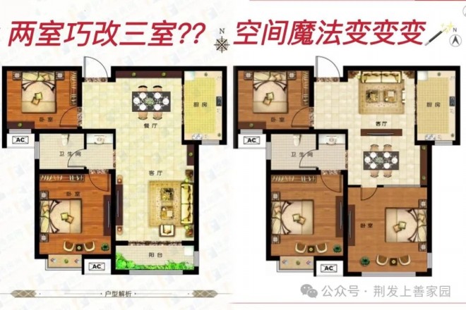 “建筑面積約95㎡小戶型,巧用靈活隔斷設計,輕松擴容第三室,科學動線+采光優化,三室也能明亮寬敞,告別壓抑感”。