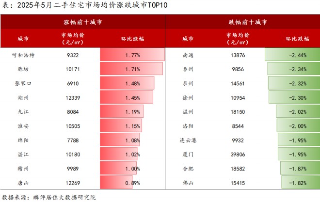 報告顯示,環比漲幅前10的城市,漲幅普遍在1%-1.8%之間,主要聚集在部分二線及三四線城市。其中,呼和浩特(1.77%)、廊坊(1.71%)和張家口(1.48%)位居漲幅前三位。