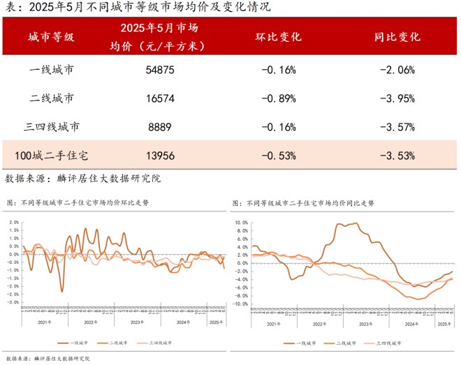 報告顯示,5月一線城市二手房市場均價為54875元/平方米,環比下跌0.16%,同比下跌2.06%;二線城市市場均價為16574元/平方米,環比下跌0.89%,同比下跌3.95%;三四線城市市場均價為8889元/平方米,環同比分別下跌0.16%、3.57%。